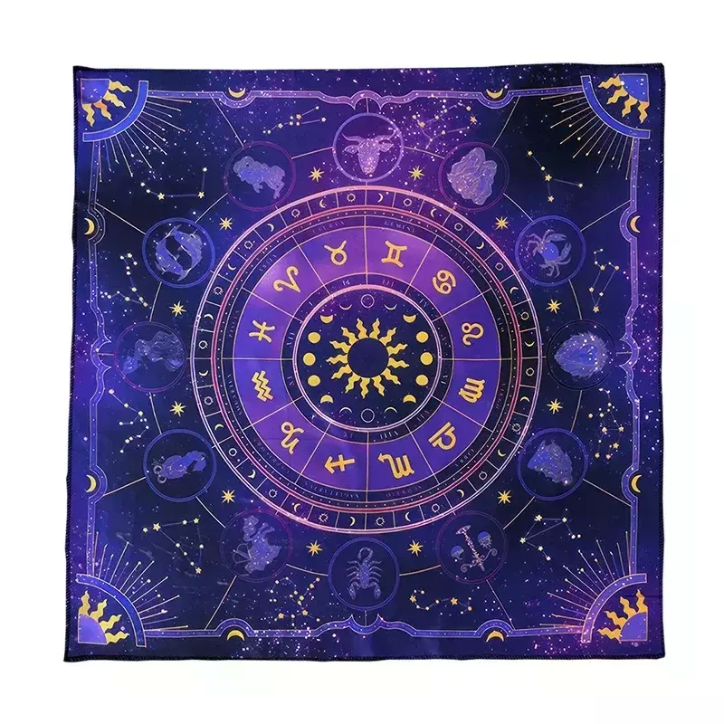 🔮 Estampada com as 12 constelações do zodíaco, o Sol central e um céu estrelado encantador, essa toalha é perfeita para leituras de tarô, práticas esotéricas, meditação ou simplesmente para decorar com um toque mágico.